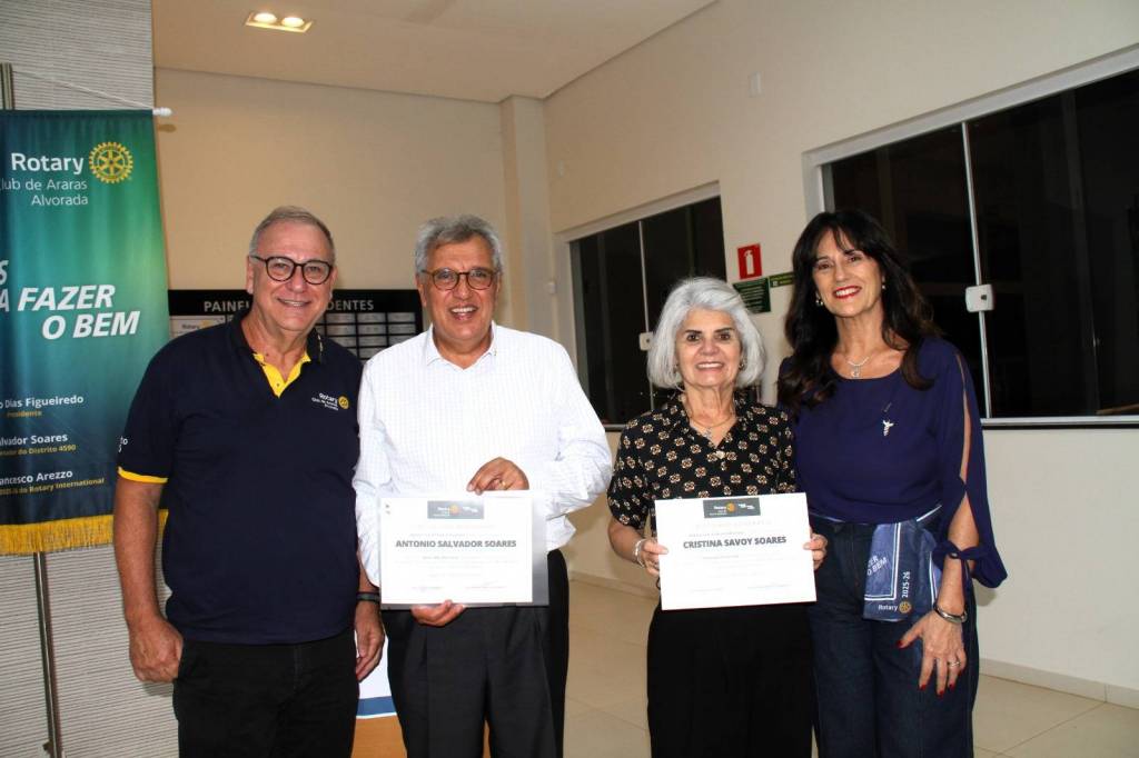 “Nesta noite tão especial, o Rotary Club de Araras-Alvorada se reveste de alegria, emoção e gratidão para celebrar um duplo motivo de orgulho: a visita oficial do Governador do Distrito 4590, Antônio Salvador Soares, acompanhado de sua esposa e coordenadora distrital, Cristina Savoy Soares, e o 19º aniversário de fundação deste nosso clube, que há quase duas décadas tem se dedicado com entusiasmo e propósito ao ideal de servir”, destacou Andrea.